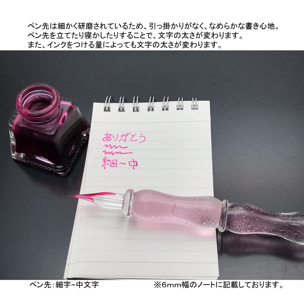 文字の大きさは細文字から中文字。インクのつけ具合と角度によって太さが変わります。
