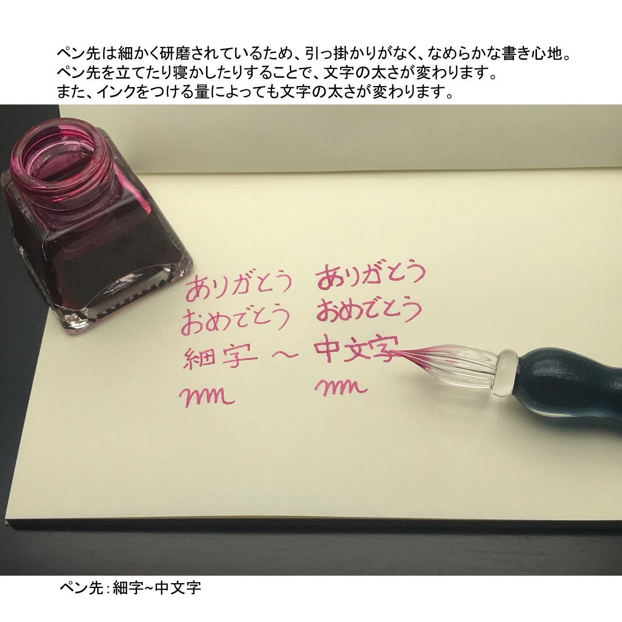 文字の大きさは細文字から中文字。インクのつけ具合と角度によって太さが変わります。