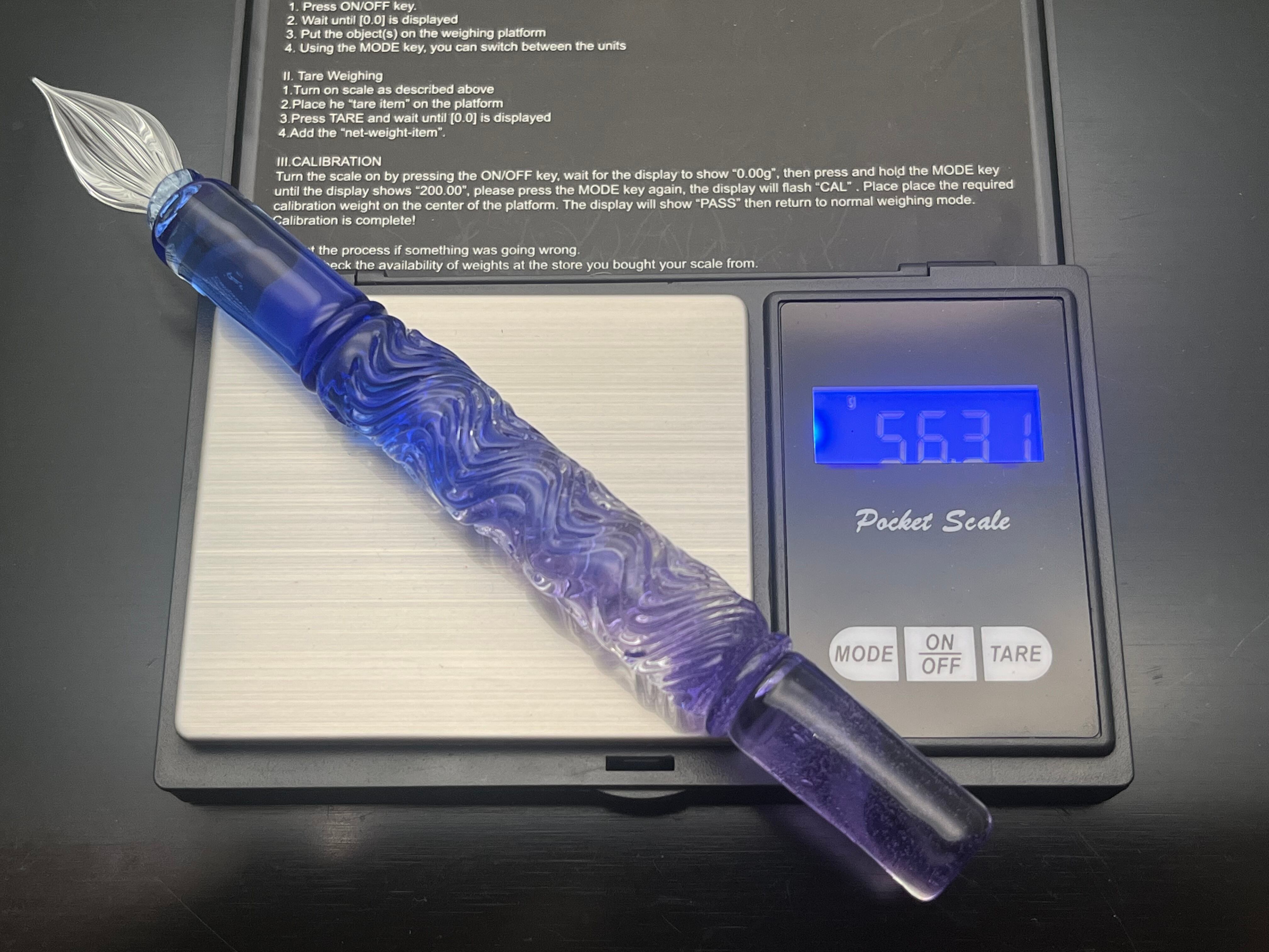 通常のガラスペンの倍の重さがあり、軸もしっかり厚みがある。重厚感と高級感を兼ね備えたガラスペンです。青と紫の花びらカラーです。