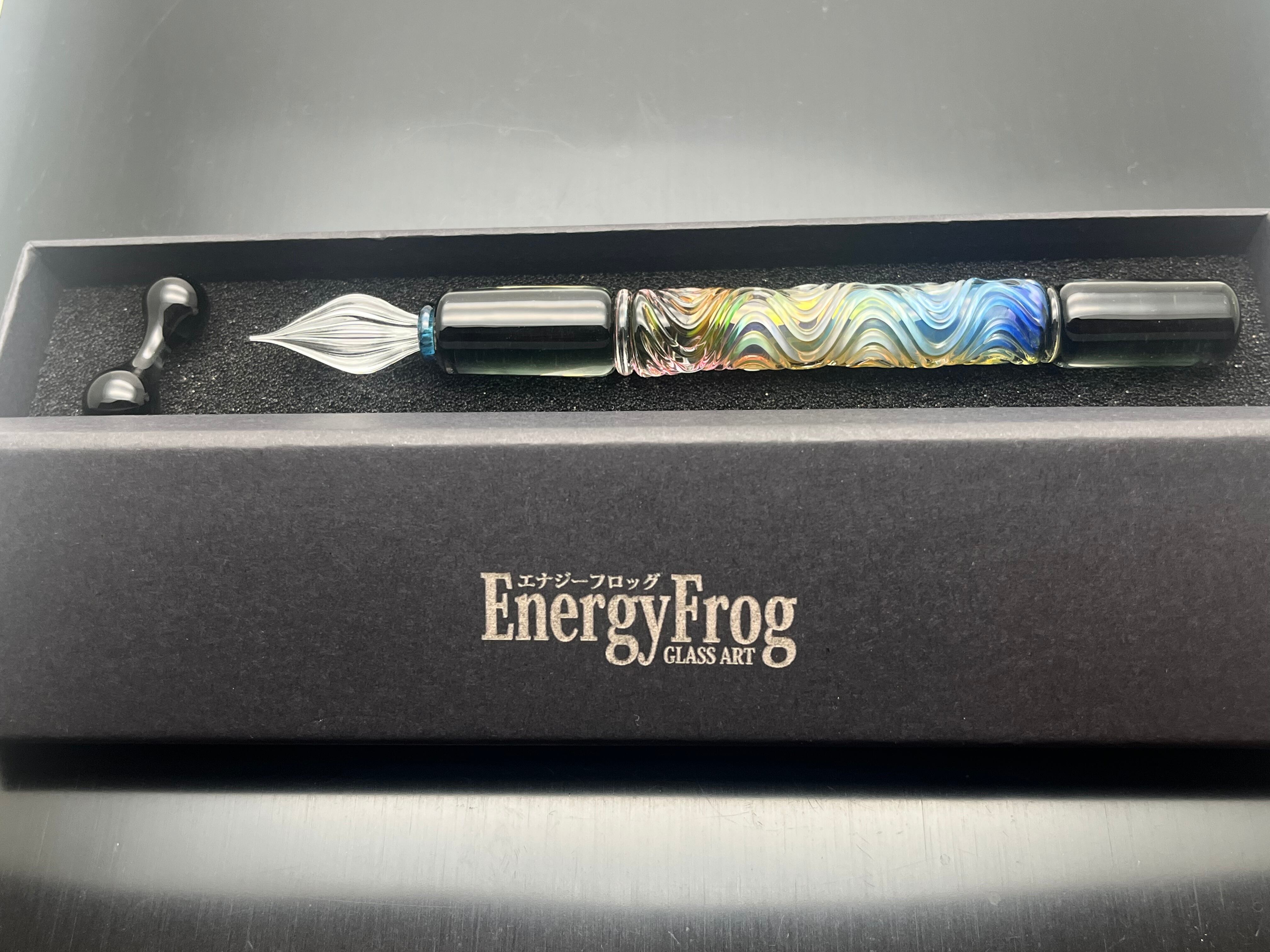 通常のガラスペンの倍の重さがあり、軸もしっかり厚みがある。重厚感と高級感を兼ね備えたガラスペンです。ヒュームによるレインボーカラーです。