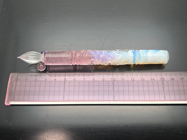 通常のガラスペンの倍の重さがあり、軸もしっかり厚みがある。重厚感と高級感を兼ね備えたガラスペンです。