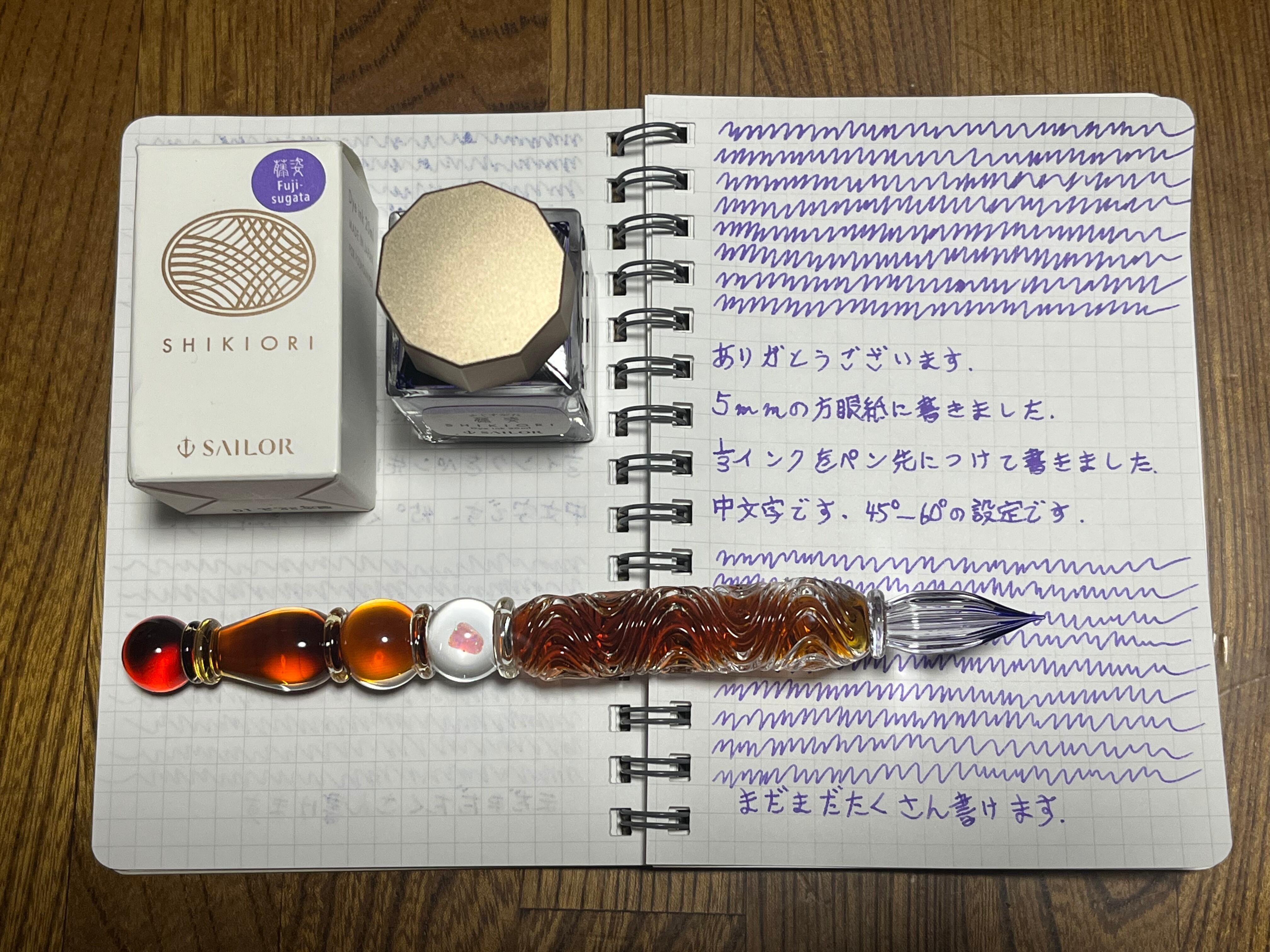 文字の大きさは中文字。インクのつけ具合と角度によって太さが変わります。